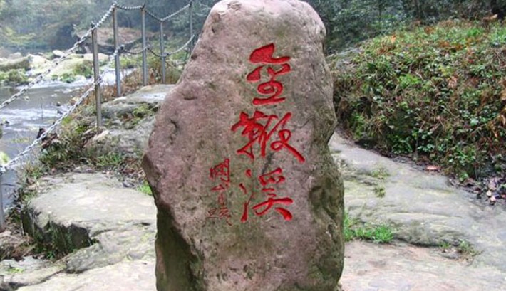 4、醉羅漢:與金鞭巖隔溪對峙,矗立在斜坡上,高200余米。 上下一般粗壯,峰體渾圓,色赤,整座石峰向金鞭溪呈70度傾斜,形似一醉酒羅漢,欲倒不倒,似醉非醉,詼諧幽默,發(fā)人情趣。自峰下向上仰望,但覺云移峰晃,感覺隨時都要崩塌之感。 清嘉慶年間學(xué)士彭之 臣在峰壁書寫一“忠”字。清道光四年(1824),貢生彭之運(yùn)作《壁忠記》一文以彰其勝。風(fēng)雨滄桑,“忠”字因山石崩塌遭毀。