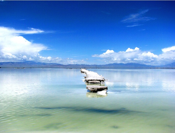 茶卡鹽湖與其它鹽湖不同的是,茶卡鹽湖是固液并存的鹵水湖,鑲嵌在雪山草地間而非戈壁沙漠上。鹽湖水域?qū)拸V,銀波粼粼。天空白云悠悠,遠處蒼山崢嶸,藍天白云、雪山映入湖中,如詩如畫。四周牧草如茵,羊群似珍珠灑落。漫步湖上,猶如進入鹽的世界。