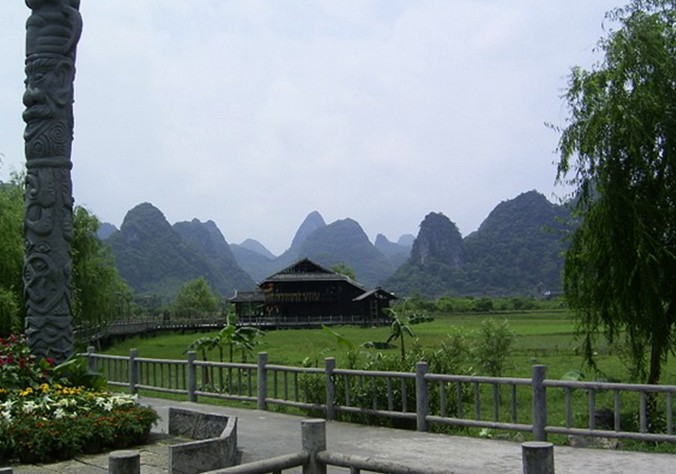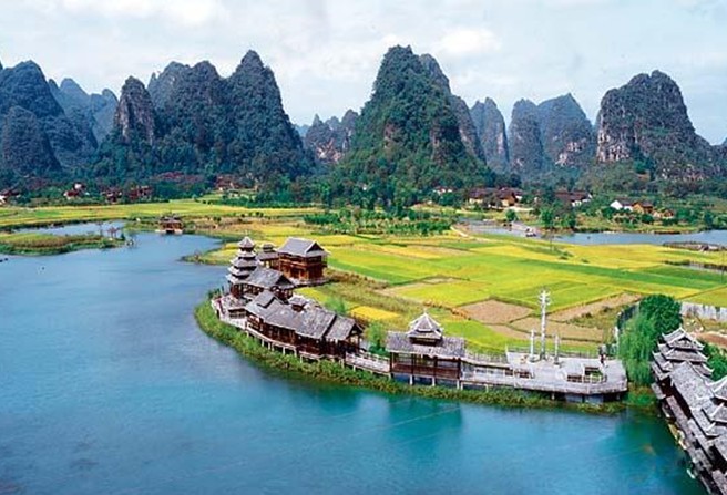 陽朔“世外桃源”主要有荷花池、燕子湖、燕子洞、侗鄉(xiāng)風(fēng)情和原始部落組成。若是“沾衣欲濕杏花雨,吹面不寒楊柳風(fēng)”的季節(jié).踏進“世外桃源”,展現(xiàn)在眼前的將是一片秀美的山水田園風(fēng)光。清波蕩漾的燕子湖鑲嵌在大片的綠野平疇之中,宛如少女的明眸脈脈含情。湖岸邊垂柳依依,輕拂水面。一架巨大的水轉(zhuǎn)筒車,吱吱呀呀地?fù)u著歲月,也吟唱鄉(xiāng)村古老的歌謠。