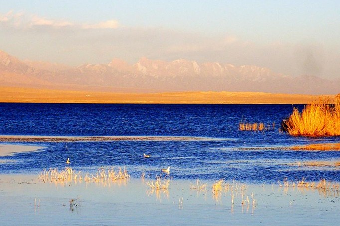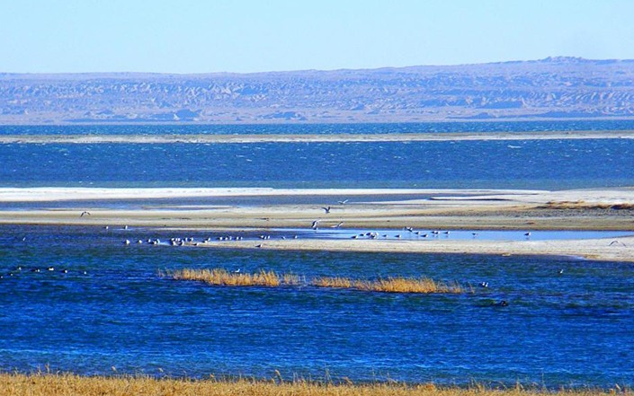 本是蒙古語(yǔ),意思是“多草的芨芨灘”,也有人說(shuō)是“水草茂美的地方”。發(fā)源于德令哈北部柏樹(shù)山中的巴音河,流過(guò)200多公里后,形成了這個(gè)面積57平方公里、平均水深7米多的湖泊。這里水草茂美,是柴達(dá)木盆地里的一個(gè)好地方??婶斂撕且粋€(gè)外泄湖,巴音河的水在湖中回旋之后,從南面的低洼處,流入與它相通的另一個(gè)湖──托素湖。