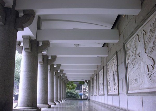 新館用融合的方法處理新舊建筑的關(guān)系,以原陳列大樓為中心,圍合前庭,強(qiáng)化兩翼,對(duì)稱布局,形成三殿式建筑,集簡練、穩(wěn)重、統(tǒng)一于一體,秩序感極強(qiáng)。