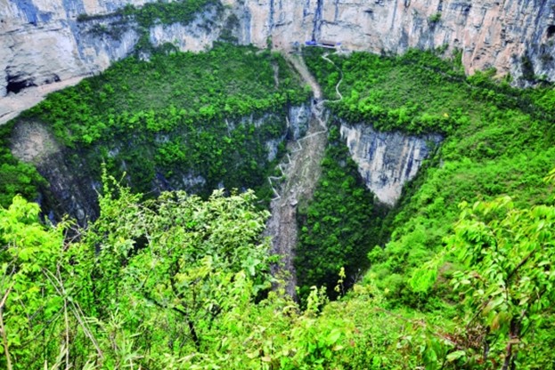 站在荊竹鄉(xiāng)九盤河右岸山頂上俯瞰,可以看見幾座山峰之間有一個(gè)深不見底的大坑,四面坑壁異常陡峭,在東北方向峭壁上,有一條羊腸小道,在豎直的石壁上盤旋環(huán)繞直至地心深處??颖谏嫌袃杉?jí)臺(tái)地:位于300米深處的一級(jí)臺(tái)地,寬2-10米,上有兩間古樸的茅草小屋,據(jù)說(shuō)曾有兩戶人家在這里隱居,在臺(tái)地上種植魔芋生存。絕壁上的羊腸小道是他們與外界的惟一通道。另一級(jí)臺(tái)地位于400米深處,呈斜坡狀,坡地上草木叢生,野花爛漫,坑壁上有幾處泉水,傾瀉而下。坑底長(zhǎng)滿了植物,郁郁蔥蔥。