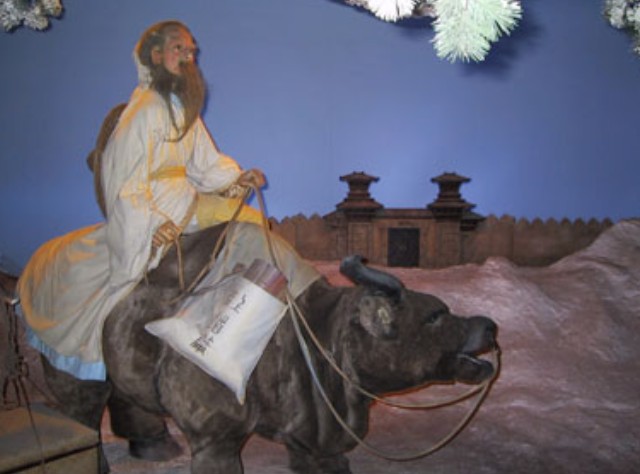 來到我國著名思想家,道德學派創(chuàng)始人,安徽渦陽人的老子展位,只見騎在青牛背上的老子,白發(fā)蒼蒼,目光炯炯有神,正緩緩向前走來,他身旁是挑著行囊的書童。隨著呼嘯的風聲,天空飄起了鵝毛大雪,轉眼間便白茫茫一片,眼前“秦界”,函谷關依稀可見。老子手中握著的牛繩一起一落,青牛不斷發(fā)出“哞哞”的叫聲,正向函谷關進發(fā),準備西去流沙。由于展區(qū)內的人物、景物采用了光電技術,人物與場景均十分逼真。
