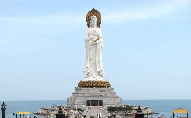 三亞南山海上觀音圣像敬造工程因其規(guī)模宏偉、意義殊勝、佛理底蘊豐富,被譽為“世界級、世紀(jì)級”的佛事工程。像體為正觀音的一體化三尊造型,寶相莊嚴(yán),腳踏一百零八瓣蓮花寶座,蓮花座下為金剛臺,金剛臺內(nèi)是面積達15000平方米的圓通寶殿。金剛洲由長280米的普濟橋與陸岸相連,并與面積達60000平方米的觀音廣場及廣場兩側(cè)主題公園,共同組成占地面積近30萬平方米的“觀音凈苑”景區(qū)。