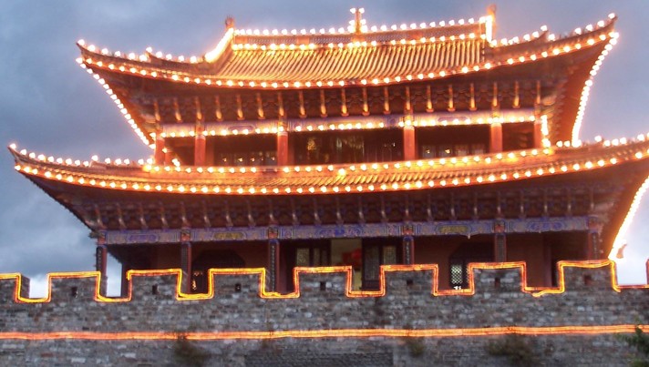 大理古城東臨碧波蕩漾的洱海,西倚常年青翠的蒼山,形成了“一水繞蒼山,蒼山抱古城”的城市格局。從779年南詔王異牟尋遷都陽苴咩城,已有1200年的建造歷史?,F(xiàn)存的大理古城是以明朝初年在陽苴咩城的基礎上恢復的,城呈方形,開四門,上建城樓,下有衛(wèi)城,更有南北三條溪水作為天然屏障,城墻外層是磚砌的;城內由南到北橫貫著五條大街,自西向東縱穿了八條街巷,整個城市呈棋盤式布局。