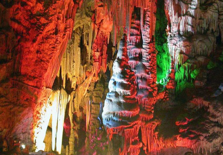 進(jìn)入洞中,人的心情驟然緊張而又企盼著什么,難以名狀。只見在彩燈的折射下,奇石林立,五光十色,令人眼花繚亂,大有美不勝收之感。什么天宮、龍宮、玉免宮……