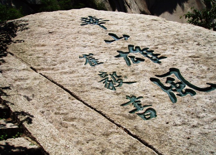 蒼龍嶺如一條橫臥在兩山之間的巨龍,在四周山色的映襯下,嶺下平臺酷似曲卷的龍尾,嶺盡處是懸石,如同回首怒吼的龍口。在龍口“云海”石刻下,肖四個圓,其中左側(cè)豎排的兩個只有圓周,而無圓心;但右側(cè)兩個既有圓周,又有圓心,為華山字謎之首,為“華山第一難題”。若細(xì)心悟之,象形文字中,圓表示“月”,圓中有點(diǎn),表示“日”。據(jù)此石刻謎底為“二月二”日。俗有二月二龍?zhí)ь^之說,在龍口云海下刻此字謎,寓意希望蒼龍永遠(yuǎn)行云布雨,真是恰如其分,匠心獨(dú)有,精紗絕倫。