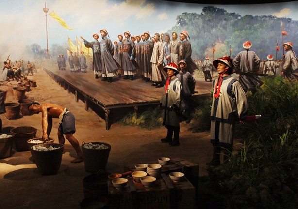 該館的陳列形式突破了傳統(tǒng)的陳列手法,注意把文物放在一定的環(huán)境氣氛中去展出,采取畫物結合,實物與輔助展品結合,采用場景、沙盤、聲光電模型、尋像放映等多種手段,使陳列形式生動、形象。如該館為了反映當年林則徐、關天培用木排鐵鏈封鎖虎門??诘那樾?,把征集來的木錨及一艘早期的劃船送上展廳,并復制了大木排鐵鏈,與長33米,高2.8 米的虎門??谛蝿荼尘爱嬒嘟Y合,版權所有山東聊城聊之旅國際旅行社有限公司,轉載必究!構成了一幅氣勢磅礴,頗為壯觀的場景,形象地再現(xiàn)了當年用木排鐵鏈封鎖虎門??诘男蝿?,大大增強了展覽的效果。