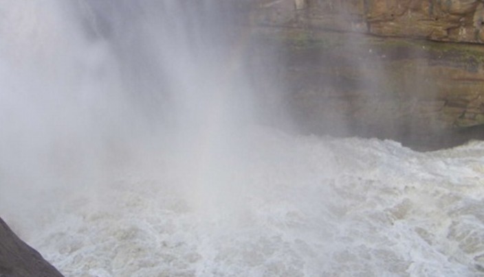 黃河壺口瀑布地質(zhì)公園以黃河為軸心,地跨山西和陜西兩省。河?xùn)|有呂梁山,河西為黃龍山。黃河壺口瀑布是黃河河道上第一大瀑布。它飛流直瀉,巨浪滔天,氣吞山河,濤聲震天,兩岸殘崖峭壁,蔚為天下奇觀。瀑布上游黃河水面寬300米,在不到500米長(zhǎng)距離內(nèi),被壓縮到20-30米的寬度。1000立方米/秒的河水,從20多米高的陡崖上傾注而瀉、造成”千里黃河一壺收”的氣概。