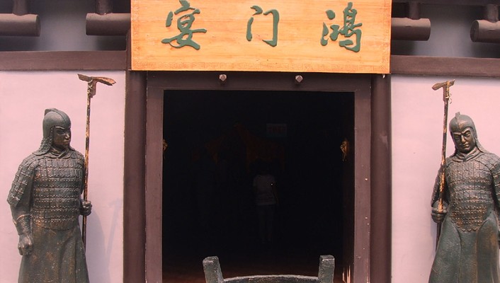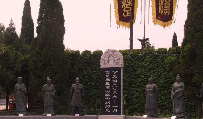 公元207年,項(xiàng)羽從謀士范增之計(jì),在鴻門設(shè)宴,企圖借機(jī)殺掉劉邦,于是演出了一幕“鴻門宴”,著名的典故“項(xiàng)莊舞劍,意在沛公”就是指這段故事?,F(xiàn)存遺址用青磚砌成,十米高的旗桿上飄揚(yáng)著杏黃色的帥旗,臺(tái)子北面建了一座蒙古包似的軍帳,門口高掛“楚高軍旗”,帳內(nèi)模擬當(dāng)時(shí)的宴會(huì)場(chǎng)面,軍帳用玻璃鋼制成,里面塑有“項(xiàng)莊舞劍、樊噲闖帳”等塑像,生動(dòng)的再現(xiàn)了當(dāng)年戰(zhàn)事中的重要一幕。