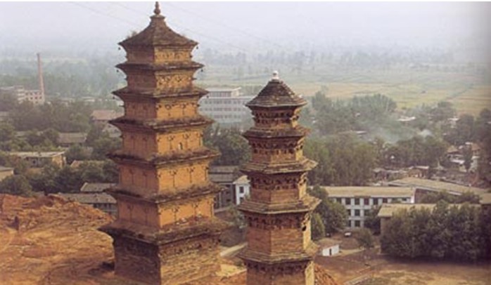 華嚴寺是中國佛教華嚴宗的祖庭。華嚴寺由初建到以后數(shù)百年間,無高大殿堂建筑的記載,而只記有鑿原為窟,以安置佛像及僧眾居住,華嚴寺可以說是黃土高原上一座典型的窟洞寺院。從塔的記載看,這里曾有華嚴宗初祖杜順坐定身骨的墓塔、二祖智儼塔、三祖賢首塔、四祖澄觀塔。但在清乾隆年間,發(fā)生了少陵原崩塌事件,僅存磚塔兩座,其余全毀。一九三0年陜西大旱,朱子橋居士來陜西賑災,與佛教界人士瞻禮華嚴寺塔時,見到元代重修碑內有"修塔即降甘露"的文句,便于塔前發(fā)愿"重修兩塔,祝愿普雨"。不日即天降大雨,朱子橋遂與佛教界人士動工修塔。