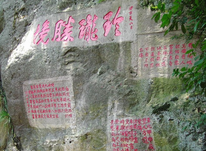 盧陵王一乾的"玉柱天關(guān)"大字,正楷,陰刻,字大見方;還有"天風海濤"、"觀海"(此石已毀)等石刻。諸家書法遒勁秀拔,各具一格,在書法藝術(shù)研究上有一定價值。