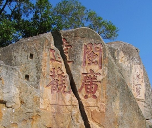 明萬歷五年丁丑季夏(公元1577年)閩粵副總兵晏繼芳題刻的"閩廣達觀"大字正楷,陰刻、每個字大一米見方。