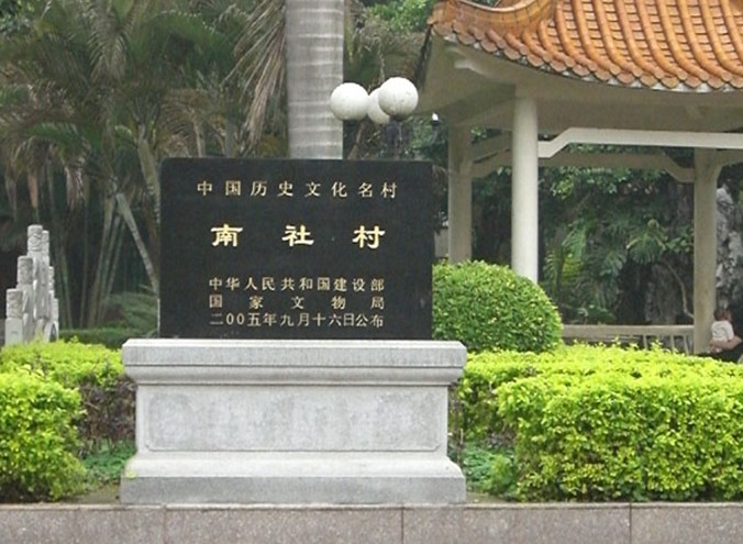 南社村莊四周綠樹成蔭,地理獨(dú)特,村莊呈合掌對(duì)居,明清期間初顯繁榮,為茶山一大村莊,很多專家稱贊:南社現(xiàn)存明清古建筑眾多,是珠江三角洲地區(qū)不可多得的完整的古村落,村內(nèi)尚保留宗祠、家廟25家、古民居120多間。