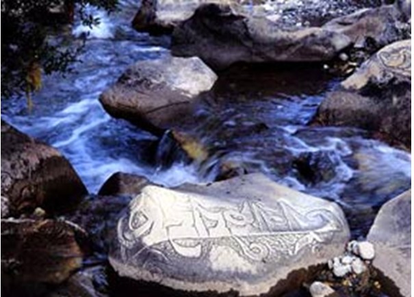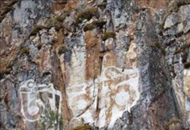 勒巴溝巖畫位于玉樹州境內(nèi)的通天河畔。沿著通天河畔的一條山徑來到這里,會使你同時產(chǎn)生兩種截然不同的情緒體驗(yàn):通天河的喧囂、壯闊和勒巴溝巖畫的靜謐、神圣。勒巴溝巖畫面江而鑿,處于勒巴溝溝口。勒巴溝內(nèi)蓊郁的草木,也難以掩蓋住由巖畫和不可勝數(shù)、遍布溝內(nèi)的嘛呢石刻散發(fā)出來的神秘氣氛。