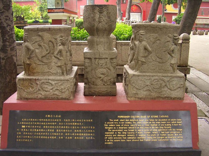 祖廟的正殿里廟內(nèi)還陳設(shè)了許多珍貴的藝術(shù)品,如70件33種兵器銅墻鐵壁儀仗,直徑1.31米的巨型銅鏡、大型銅鼎銅鐘和香爐。鐵器有大鐵鼎,鐵鼎,鐵畫等等。園內(nèi)還陳列有石刻匾額,明、清時期的石獸、碑刻唐代“貞觀二年”款棋字陽文“禪城”,石片旁的復(fù)制品。重新組合復(fù)完的陶塑瓦脊,大量的金木雕建筑構(gòu)件,大型鐵鑄武士立像,鐵鑄瑞獸、鐵炮等等。這些陳列品集中反映了明清時期佛山高超的工藝技術(shù)。無怪乎,一些前來參觀的外國朋友將祖廟譽(yù)為“東方民間藝術(shù)之宮”。