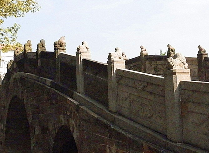 該橋?yàn)榱菏饺资皹?,紅色沙巖石構(gòu)筑。全長(zhǎng)24.8米,頂寬4.7米,高4.5米。橋拱為縱聯(lián)砌置法,橋欄華板刻有各種花紋圖案。兩旁望柱各十四條,柱頭雕石獅一只,現(xiàn)僅存十只。