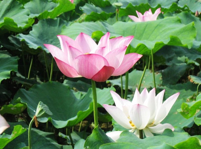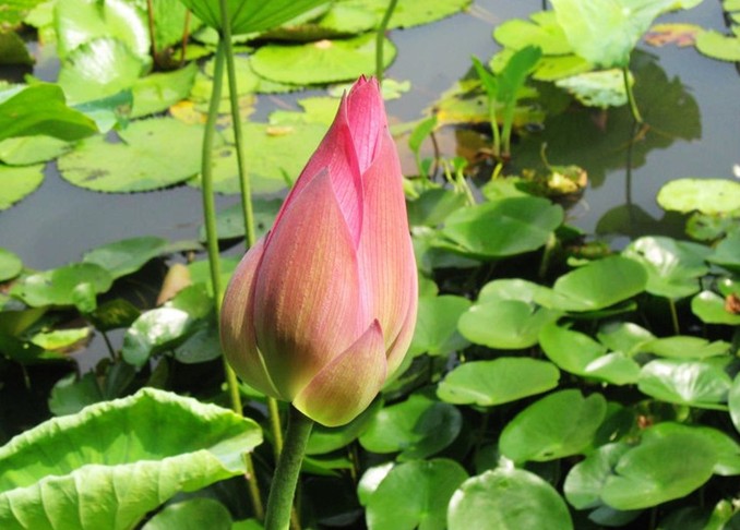 站在青石砌成的觀賞臺(tái)上,憑欄而觀,仿佛是綠波蕩漾中的一葉小舟,在此起彼伏的一片荷海中,隨波輕漂,粉霞點(diǎn)點(diǎn),宛如天成的錦繡。怒放者有之,含苞者有之,傲然挺立者有之,含羞隱藏者有之,形態(tài)各異,各種風(fēng)姿盡收眼底。