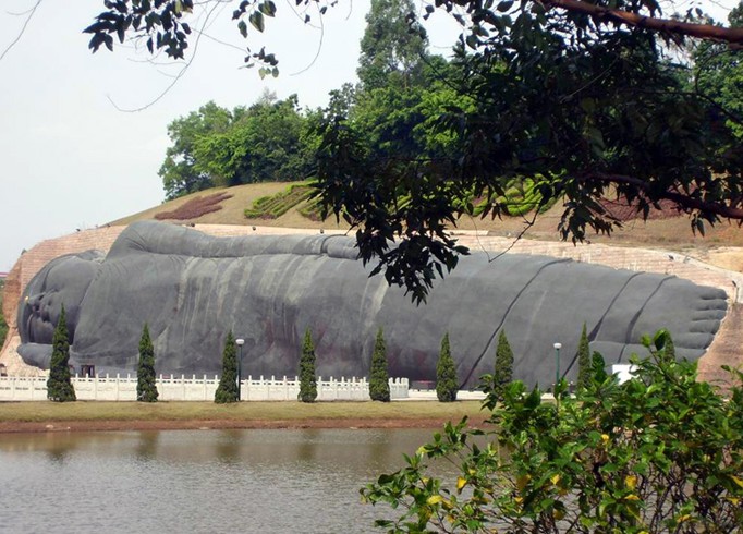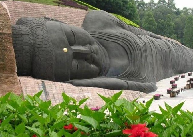 大臥佛位于森林公園天仙巖。相傳當(dāng)年佛教大師六祖惠能傳教后深夜經(jīng)過這里,看到天仙巖靈光閃爍,隱約可見這塊橫臥的大石塊就是一個(gè)大臥佛,六祖立即跪拜,求佛祖降福天下。大臥佛的雕造從這個(gè)傳說獲取靈感,以盛唐敦煌臥佛為范本,佛身長(zhǎng)108米,尺度堪稱世界之最?,F(xiàn)經(jīng)改造用紫銅包裝大臥佛,成為金裝大臥佛。大佛前面是錦鯉池和荷花池,與大佛相互映襯引人入勝。大佛對(duì)岸一層為長(zhǎng)六十米的長(zhǎng)廊,廊內(nèi)彩繪佛傳故事,二層為敬佛臺(tái),憑欄對(duì)拜,大佛全景一覽無遺。