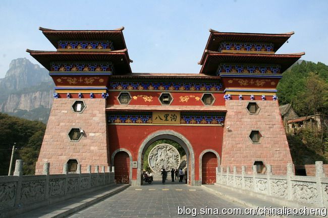 一灣碧水、兩溪交匯指的是八里溝與西蓮溝的兩條溪流在此處匯流成鳳凰灣;三組古建指的是由橋頭堡、二仙橋、山門服務(wù)樓組成的漢唐建筑群和明清建筑的八里溝大酒店以及太行石屋式建筑。