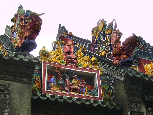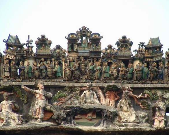 陳氏書院的陶塑五彩繽紛,琳瑯滿目,令人目不暇接。書院的正脊采用佛山陶塑共11條。首進5條和聚賢堂脊飾分別于光緒十七年(1891年)(聚賢堂脊飾 于1976年被臺風(fēng)刮倒,于1981 年重塑)和十九年(1893年)燒制,中、后進的4條脊飾于光緒十八年(1892年)燒制,后進大廳的脊飾則完成于光緒十六年(1890年)。11條脊飾中以聚賢堂的規(guī)模最大,其總長27米,高2.9米,連灰塑基座總高達4.26米。全脊共塑224個人物,題材包括八仙賀壽、加官進爵、虬髯客與李靖等,整條脊飾恰似一個巨大的舞臺。其他脊飾的題材主要是龍鳳、花鳥、瑞獸、山水以及歷史故事和人物群像等。