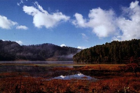 周圍的五寶山,森林茂密,野生動植物種類繁多,尤其是原生的云南松林保存了良好的生態(tài)環(huán)境,池畔環(huán)境幽靜,周圍山巒疊翠,湖光山色融為一體,風(fēng)光四季不同,使人仿佛置身于變幻的畫卷之中。