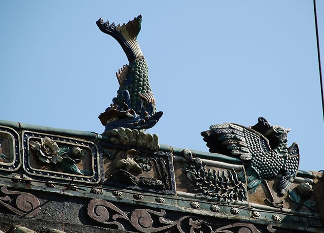 大殿是南海神廟的第四進(jìn)。它是仿明代木結(jié)構(gòu)琉璃瓦歇山頂建筑。屋頂用綠色的琉璃瓦覆蓋;中間有雙鳳飛翔、鰲魚倒懸等紋飾的琉璃瓦脊;上部有兩條軀體彎曲作騰飛疾走狀的蒼龍?jiān)煨?,它正在?zhēng)奪當(dāng)中的寶珠。據(jù)說,雙鳳代表美麗,整魚代表自由,蒼龍代表權(quán)力,而寶珠代表智慧。