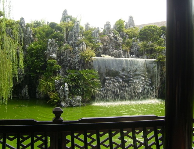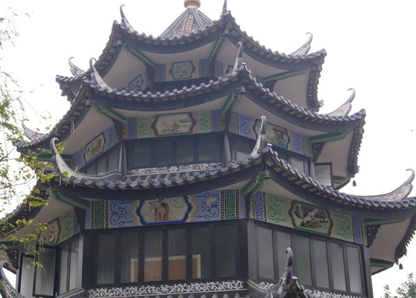 行到回廊深處,便是遠(yuǎn)近聞名的“玲瓏水榭”了。它環(huán)水而立,是園內(nèi)第四所建筑俗稱“八角亭”。水榭呈八角形,八面全是窗戶,結(jié)構(gòu)高雅。這樣一來,既能八面通風(fēng),又可以八面觀景。對(duì)于八角亭的八景,有一首五律詩概括得很好,那詩就是:“丹桂迎旭日,楊柳樓臺(tái)青;臘梅花開盛,石林咫尺形;虹橋清輝映,臥瓢聽琴聲;果壇蘭幽徑,孔雀盡開屏。中國園林建筑藝術(shù)風(fēng)格獨(dú)特,強(qiáng)調(diào)詩情畫意。“玲瓏水榭”之所以遠(yuǎn)近傳名,就因?yàn)樗扔性娗?,又有畫意?/p>