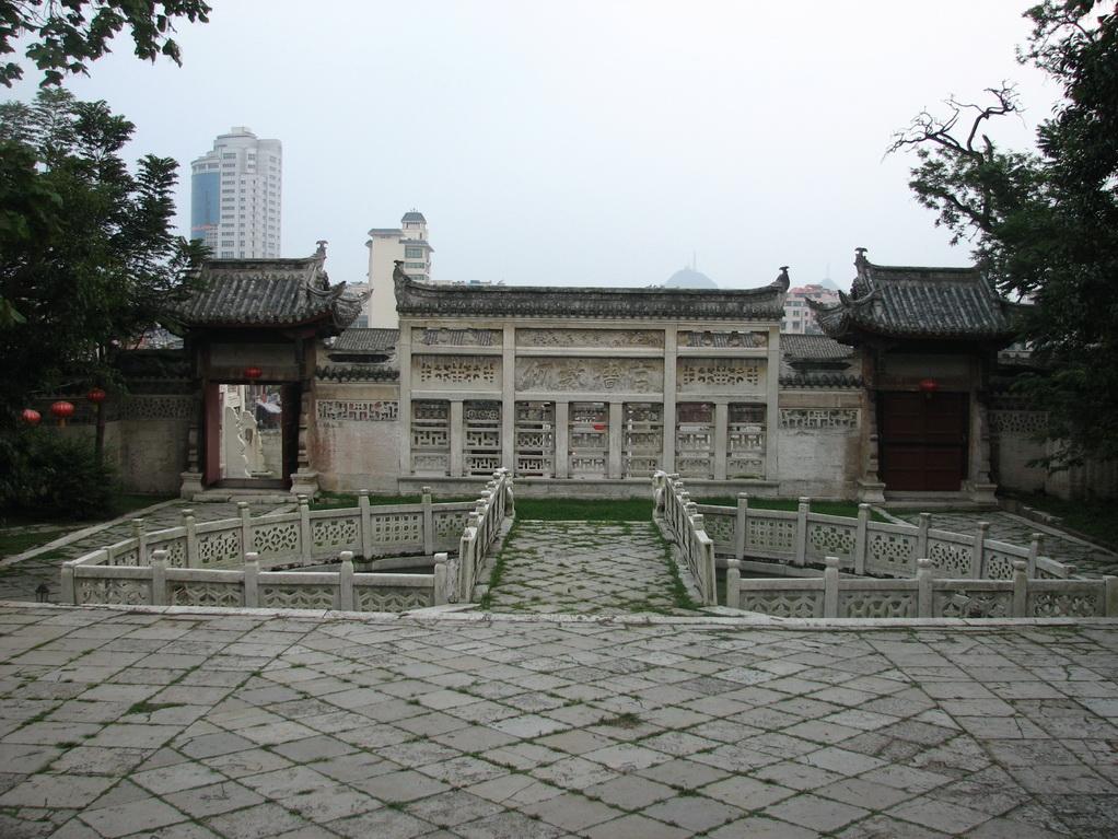 左右兩排石欄將第二進大院分為前后院,前院正中有一半月形水池,稱為“泮池”;池上正中有一小石橋,稱為“圜橋”。池畔均繞以石欄,石欄上刻有空花果品。石橋雖小,卻也拱有三個橋孔,頂懸有獅頭。從泮池橋上望去,在兩米高的臺基上,又有一座雄偉壯觀的石雕花牌坊巍然挺立,坊楹上刻有“欞星門”三個大字,在它的前面左右坊門腳下,各鋪有七級垂帶踏跺。它的坊柱上刻有八仙,坊欄上鏤有戲文以及展現(xiàn)過去讀書人功成名就的畫面,氣氛濃烈,構(gòu)圖細膩,生動逼真。在欞星門兩側(cè),各有一硬山頂建筑物,稱為“節(jié)孝祠”和“名宦祠”。 經(jīng)欞星門,便到了文廟的第三進大院,亦是由方形石板鋪地,呈長方形。院子的左右兩端,各有一棟重檐歇山頂建筑物,造型相同,左面的為“奎文閣”,右面的尊經(jīng)閣已毀。