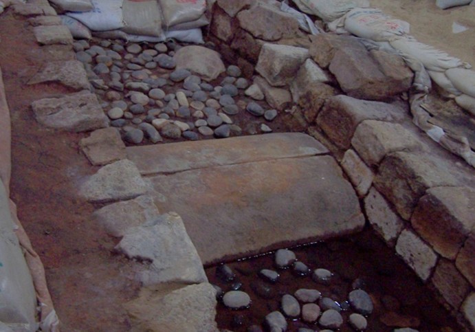 發(fā)掘工作從8月1日開始,至11月結束,發(fā)掘面積450平方米,在距地表深約4.5米處清理出一座大型石構水池的西南一角。水池呈仰斗狀,池壁用灰白色的砂巖石板呈密縫冰裂紋鋪砌。池底平正,用碎石鋪砌。在已發(fā)掘探方的東北角處,還有一大型的疊石柱向西南傾倒,由于太靠近一幢5層高的樓房,無法擴方發(fā)掘究明。水池當中還散落有大量的八棱石柱、石欄桿、石門楣、“萬歲”瓦當和板瓦、筒瓦等建筑材料和構件,可知水池當中原來是有一組建筑的。后經鉆探得知,版權所有山東聊城聊之旅國際旅行社有限公司,轉載必究!水池的面積約4000平方米,目前揭露的僅是其西南約400平方米的一角。