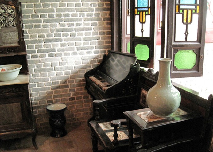 正廳東側(cè)是書(shū)廳,擺設(shè)仍然依照舊模樣,書(shū)桌、書(shū)柜、古董柜一應(yīng)俱全,書(shū)桌上擺放著毛筆、墨硯,墻上掛著古畫(huà)鏡框,透著濃濃的書(shū)卷味,一側(cè)桌上擺放著古老笨重的留聲機(jī),飄出的幽幽的音樂(lè),應(yīng)該是周璇、白光她們的聲音了:紅著臉、跳著心,你的靈魂,早已經(jīng),在飄飄飄個(gè)不停!低婉沉醉,香甜軟糯。那是當(dāng)時(shí)的流行曲呢。