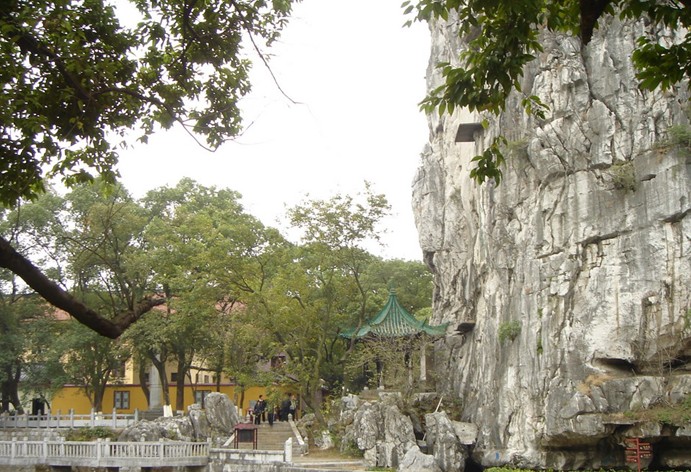 位于獨(dú)秀峰西北麓, 洞口向月牙池, 高約3米, 寬5.6米, 深32米, 面積約180平方米。明戶露《赤雅》載: “雪洞乳石最奇。”洞壁呈白色, 所懸乳石潔白如雪。洞口刻有“雪洞”二字, 旁有雙鳳石。原有唐人詩(shī)刻, 今泯滅無(wú)存。
