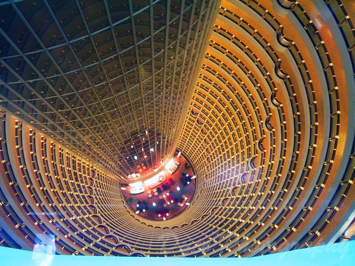 全國首批4A旅游景點金茂大廈88層觀光廳,面積為1520平方米,高度340.1米,是目前國內(nèi)最高最大的觀光廳,榮膺上海大世界基尼斯之最。版權(quán)所有聊城聊之旅國際旅行社有限公司,轉(zhuǎn)載必究!兩臺每秒運行9.1米的垂直升降電梯,一次可乘載33位旅客,只需45秒鐘可將游客從地下一層直送88層。登高遠眺,大上海的景觀盡收眼底,浦江兩岸高樓林立,黃浦江上百舸爭流,您可親身體驗"落霞與孤騖齊飛,秋水共長天一色"的美景。賞完外景,您還可以從上往下觀賞世界舉世無雙的酒店中庭,它直徑27米,28道環(huán)廊扶手在霓虹燈的照射下,金光閃閃。一道道環(huán)廊如同一排排畫廊,美不勝收。此情此景,無不激動人心,您會不由自主地拿起照相機留下永恒的紀念。金茂大廈無與倫比的酒店中庭被建筑師、科學(xué)家、文學(xué)家譽為“共享空間”、“金色的年輪”、“時空隧道”。