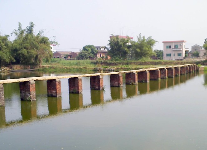 沿著彎彎的鄉(xiāng)間小路,可來(lái)到古勞水鄉(xiāng)一處名叫“二渡橋”的地方。只見(jiàn)前面的圍墩上,有幾棵百年老榕,靜靜地鎮(zhèn)守和護(hù)衛(wèi)著這一方水土。榕蔭下,幾塊長(zhǎng)條花崗巖石條曲曲折折地架在魚(yú)塘邊的木樁上,頗有一種“小橋流水人家”的韻味。這種花崗巖石條,當(dāng)?shù)厝朔Q它“條石”或“西樵石”。因水鄉(xiāng)的泥土細(xì)滑,不易滲水,偶爾幾滴小雨,這里便遍地泥濘,行走不便。于是居民們便用這種“條石”沿著小河涌和糖基鋪路,形成了遍布水鄉(xiāng)的石板小橋和石板小路,構(gòu)成一幅獨(dú)特的風(fēng)景。