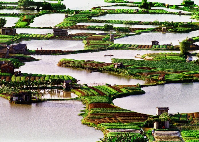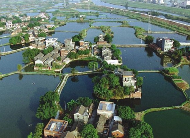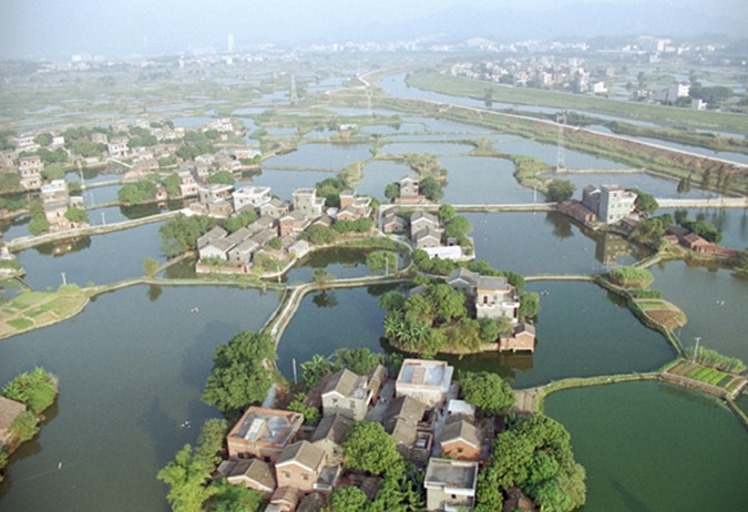 古勞堤內(nèi)水網(wǎng)縱橫交錯(cuò),小艇穿行如梭,兩岸蕉林搖曳,萬(wàn)畝魚(yú)塘似明鏡耀目,千頃桑地綠海翻波,那青青的田疇就像精雕的翡翠,好一派旖旎的南國(guó)水鄉(xiāng)風(fēng)光。