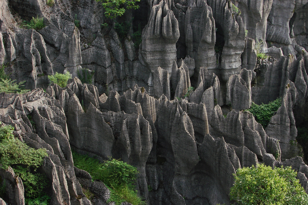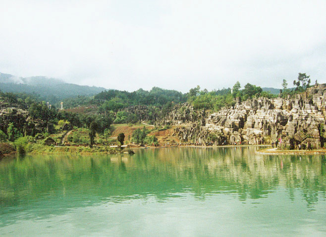 該類景觀典型的喀斯特地貌,表面呈虎皮狀。在這里,群峰壁立,奇峰危石,可謂千姿百態(tài),石門、石寨、石柱等,酷似人工堆疊,卻無人工痕跡;飛禽走獸的石頭,栩栩如生、惟妙惟肖;田園阡陌、炊煙裊裊,清泉碧池,清麗若未施粉黛的閨秀楚楚動(dòng)人。顯示出萬盛石林景觀的美感與靈性。