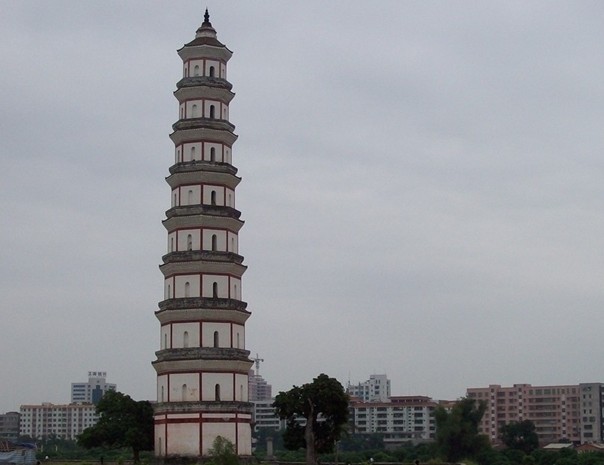 寶光塔位于高州市區(qū)西南部的鑒江河畔上,建于明代萬歷四年( 1576 )。該塔為八角九層樓閣式磚塔,通高 65.8 米,底層邊長 5.72 米。塔身全部用青磚砌筑。塔基為須彌座,束腰部分各面均嵌有花崗巖浮雕圖案 3 幅,每幅浮雕長 1.45 米,高 0.55 米。浮雕內(nèi)容分別有吉祥富貴、雙鳳朝陽、鵬程萬里、魚躍龍門,還有獨(dú)具特色的高州香蕉圖等。兩幅浮雕之間,鑲嵌一塊竹節(jié)形石浮雕相隔。