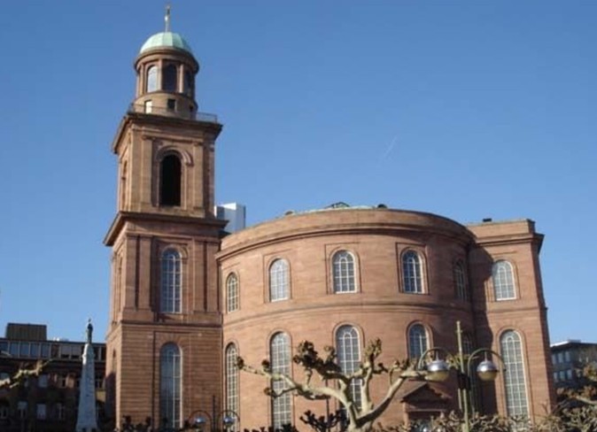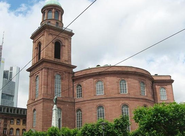 保爾教堂(Paulskirche)又譯圣保羅教堂(St. Paul's Church)坐落于德國法蘭克福,始建于1787年,是一座橢圓形的新教教堂,是德國重要的政治象征符號。是當時為了取代方濟各會教堂(赤腳修士的教堂)(Barfüsserkirche)由該市建筑大師約翰`安德烈亞斯`李卜哈特(Johann Andreas Liebhardt)所設(shè)計的。1833年,這座雄偉的古典砂巖教堂終于落成。