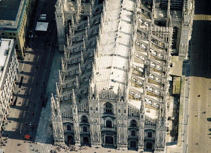 米蘭大堂是世界上最大的哥特式建筑,有“米蘭的象征”之美稱。主教堂始建于1386年,由米蘭望族吉安?維斯孔蒂主持奠基。1500年完成拱頂,1774年中央塔上的鍍金圣母瑪麗亞雕像就位。1813年教堂的大部分建筑完工。1897年最后完工,歷時(shí)五個(gè)世紀(jì)。1805年拿破侖曾在米蘭大教堂舉行加冕儀式。至1965年教堂正面最后一座銅門被安裝,才算全部竣工。