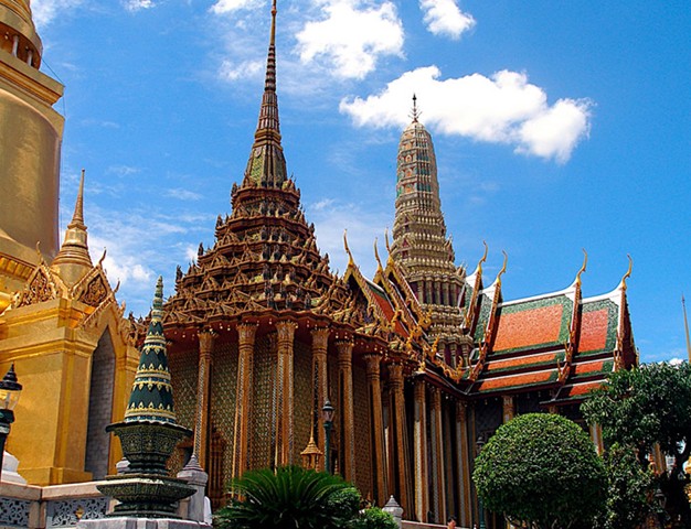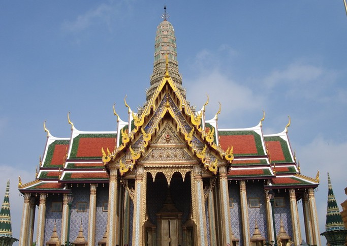 大皇宮位于曼谷市中心區(qū), 由一組布局錯(cuò)落的建筑群組成,匯集了繪畫、雕刻和裝怖藝術(shù)的精華。 曼谷王朝開國(guó)君主拉瑪一世登基后,于1782年把首都從吞武里遷至湄南河?xùn)|岸的曼谷,經(jīng)歷代不斷擴(kuò)建,終于建成規(guī)模宏大的大皇宮建筑群。大皇宮是泰國(guó)諸多王宮之一,是歷代王宮保存最完美、規(guī)模最大、最有民族特色的王官,現(xiàn)僅用于舉行加冕典禮、宮廷慶祝等儀式。曼谷王朝從拉瑪一世到拉瑪八世,均居于大皇宮內(nèi)。1946年拉瑪八世在宮中被刺之后,拉瑪九世便搬至新宮居住。大皇官對(duì)外開放,成為泰國(guó)著名的游覽場(chǎng)所。建筑群共22座,主要建筑是4座各具特色的宮殿,從東向西一字排開,一色的綠色瓷磚屋脊、紫紅色琉璃瓦屋頂、鳳頭飛檐。屋頂是典型的泰國(guó)“三頂式結(jié)構(gòu)”,集泰國(guó)數(shù)百年建筑藝術(shù)之大成。有人稱此處為“泰國(guó)藝術(shù)大全”。