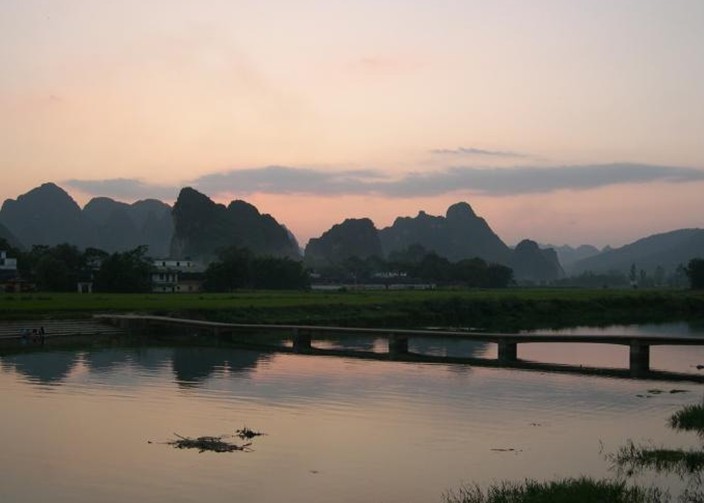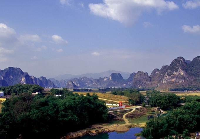 榮強小桂林距九龍鎮(zhèn)南一公里,群峰拔地而起,峰間小河碧水,兩岸鳳尾竹隨風搖曳,青峰倒影其中,真似“山如碧玉簪、江作青羅帶”的桂林旖旎風光。