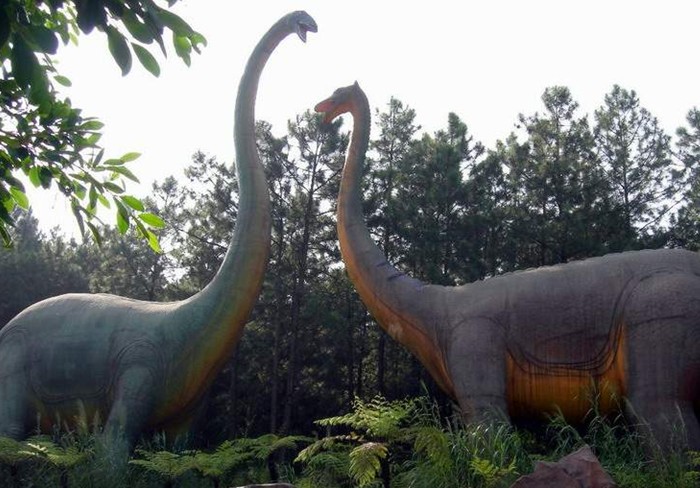 按照1:1的比例設(shè)計制作的兩條仿真恐龍栩栩如生。較高的是梁龍,身體背部為綠色,尾巴特別長達(dá)16米,脖子也接近13米長,身體總長達(dá)40米,身高達(dá)22米,堪稱目前世界上最高、最大的仿真恐龍!在它旁邊的身高稍矮、體型稍小一點的巨龍也并不能小看,棕黃色的身軀也有18米之高,體長近40米。