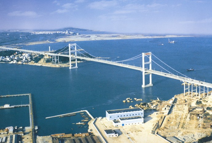 位于汕頭港東部出入口媽嶼島海域處,為跨海公路橋。橋面跨越礐石海, 全長2500米。由3部分組成:南面是跨黃沙灣南航道的預(yù)應(yīng)力鋼筋混凝土加大橋勁梁懸索橋;北面是跨北航道的預(yù)應(yīng)力鋼筋混凝土梁式橋;中部為橫跨媽嶼島上的預(yù)應(yīng)力高架旱橋。橋主孔通航凈跨度452米,通航凈高46米,可以通過5萬噸級(jí)船舶。這座大橋是深汕兩地一級(jí)汽車專用公路的配套設(shè)施,是連結(jié)深圳、珠海、汕頭、廈門等4個(gè)經(jīng)濟(jì)特區(qū)的陸地交通紐帶。
