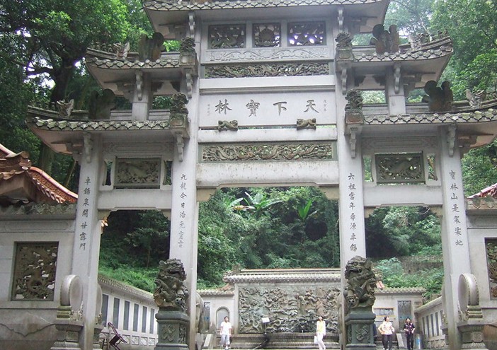 據(jù)明萬歷《曹溪通志》記載:南朝梁武帝天監(jiān)元年,印度高僧菩提達(dá)摩東土弘法,歷經(jīng)三年海上航行,首站登陸嶺南。見此地“山水匯合,峰巒奇秀,嘆如西天寶林山也”,遂建議地方官奏請(qǐng)武帝建寺。天監(jiān)三年(公元504年),寺廟建成,梁武帝賜額“寶林寺”。唐儀鳳二年(公元677年)始,中國(guó)佛教禪宗創(chuàng)始人六祖惠能大師來寶林寺說法37載,使南宗禪法大播于天下。故南華寺素有南禪祖庭之稱,還與嵩山少林寺并稱為禪宗祖庭,在東南亞、朝鮮、韓國(guó)、日本以及歐美等國(guó)家和地區(qū)有重要影響。武則天萬歲通天元年(公元696年),武則天賜慧能水晶缽盂、磨衲袈裟等物。唐神龍?jiān)辏ü?05年),中宗又賜寶缽、磨衲袈裟等物,并將寺名賜改為“中興寺”;神龍三年(公元707年)再改“法泉寺”。宋開寶元年(968),太祖賜額改稱“南華禪寺”,沿稱至今。1983年,南華寺被確定為全國(guó)重點(diǎn)寺廟。今南華寺占地總面積約42.5萬平方米,主體建筑群總面積1.2萬平方米。為階梯式中軸線對(duì)稱平面布局。寺向?yàn)樽背?。中軸線上由南至北依次為曹溪門(頭山門)、放生池(上筑五香亭)、寶林門(二山門)、天王殿、大雄寶殿、藏經(jīng)閣、靈照塔、祖殿、方丈室。自天王殿始作封閉,東側(cè)依次為鐘樓、客堂、伽藍(lán)殿、齋堂等;西側(cè)依次為鼓樓、祖師殿、功德堂(亦稱西歸堂)、禪堂、僧伽培訓(xùn)班等。主體建筑院落外,北側(cè)有卓錫泉(俗名九龍泉)、伏虎亭、飛錫橋;西側(cè)有無盡庵、海會(huì)塔、虛云和尚舍利塔;東側(cè)有中山亭。