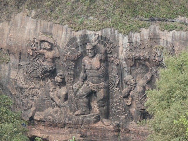 在摩崖峭壁上,以《盤古開天地》、《女媧補(bǔ)天》、《后羿射日除獸》組成我國神話傳說的《華夏魂》,高14米、寬20米的大型摩崖石雕。百步天梯之下,是地勢隱蔽的狹谷,傳說金雞的配偶就選擇這塊地方下蛋,故稱蛋谷。母雞把孵出的小雞,一群群地帶往外地安家落戶,繁衍子孫。樂昌古佛巖的“鷹撲雞群”一景,有人說就是它他的后代。登上螺旋梯的頂端,就是“朝陽亭”了,何謂朝陽亭?就是不論是旭日東升,還是夕陽西下,陽光總是照射到這個(gè)亭子。