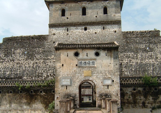 古城堡內(nèi)攻、防、守相結(jié)合的設(shè)計(jì)環(huán)環(huán)緊扣,以一個(gè)主樓(也稱中樓)和四個(gè)炮樓為主軸,東西兩面城墻中間各有個(gè)瞭望臺(tái),其間用圍墻相連。主樓為五層,高15.3米,四個(gè)炮樓比主樓稍矮,為13米,圍墻四面以走馬廊相連,廊分兩層,底層寬3.15米,可用作住戶,據(jù)稱可住千人;上層寬1.2米,聯(lián)通包括主樓在內(nèi)的五個(gè)炮樓,值此守望相助。走廊每隔3.9米有一小炮眼,共有55個(gè)小炮眼,炮眼居高臨下,從不同角度可消滅不同方向來(lái)犯之?dāng)场?/p>