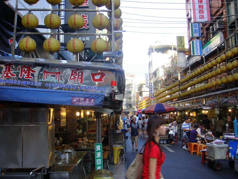 目前的基隆廟口,除了原有于仁三路的小吃攤販區(qū)(狹義的基隆廟口)之外,也與日后逐漸興起的愛(ài)四路夜市連成一氣,呈“┘”形狀(橫躺的“L”形)聚集。
