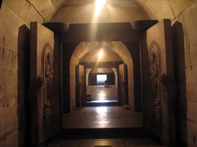 盡管清廷的遺臣為修建崇陵費盡心思,光緒還是沒有能夠在他的地下寢宮里平安地長眠下去。1931年軍閥混戰(zhàn)時期,一伙不明身份的兵匪盜掘了崇陵地宮,多數(shù)隨葬品被劫走。1980年6月,經(jīng)上級批準,清西陵文物管理處開啟地宮,清理整修,供國內(nèi)外游客參觀。這座地宮墓道全長63.19米,是無梁無柱的石拱券式建筑,共有四道石門、九座券。門樓、門垛、門框、門簪均用青白石作原料,雕有瓦脊、瓦壟、花瓶等圖案,每道石門上都有巨大的銅鑄門管扇,八扇石門上分別雕有八大菩薩立像,金券內(nèi)有寶床,寶床正中有金井,光緒皇帝和隆裕皇后的棺槨停放在寶床上,棺槨周圍有用五彩繪制的龍山石16塊,寶床前東西各有石座兩個,座上有香箱,是存放“冊”、“寶”用的。這座地宮雖已被盜,但仍出土珠寶玉翠等文物數(shù)百件。