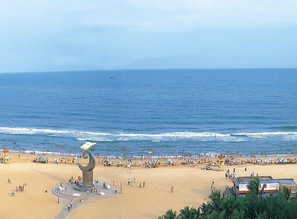大角灣風(fēng)景名勝區(qū)位于廣東陽江市海陵島西南端,三面群峰拱護,面向浩瀚南海,沙灘長2.5公里,寬100米,因狀似牛角,故名“大角灣”。這里地處南亞熱帶,全年日照時間長,年平均氣溫22.8℃,水溫23.5℃,降雨量1816毫米,年晴天數(shù)310天,四季氣侯宜人,素以陽光燦爛明媚,沙質(zhì)均勻松軟,海水清澈純凈,空氣清新純潔而著稱,各類質(zhì)素均達國際一類(級)標準,又因沙灘寬闊平坦。