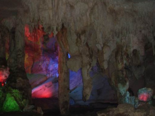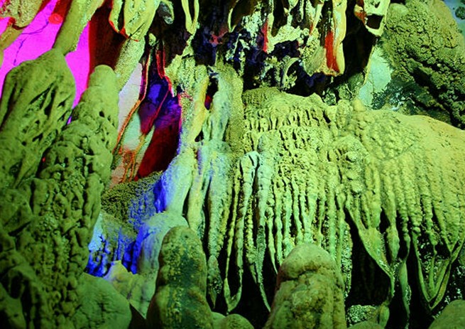 位于陽春市春灣景區(qū)內,巖洞全長1400米,龍泉溪水清澈,洞如長廊形,景物鬼斧神工、玲瓏剔透,有如龍宮之物。巖洞全程分四段:首段"迎賓廊","鐘乳寶塔"、"彩旗彩帶"招展,"石鼓"咚咚,"龍王水族"栩栩如生;次段是"龍王殿",兩側玉乳玲瓏,"龍宮浮雕"、"宮壁繡錦"惟妙惟肖;第三段為"聚寶庫",庫藏"鎮(zhèn)宮寶塔"、"定海神針"、"金玉龍床";第四段為"龍舟",其間石筍石幔琳瑯滿目。